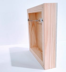 Measures 12 x 12 inches, and it is made on a cradle panel, 2 inches deep.